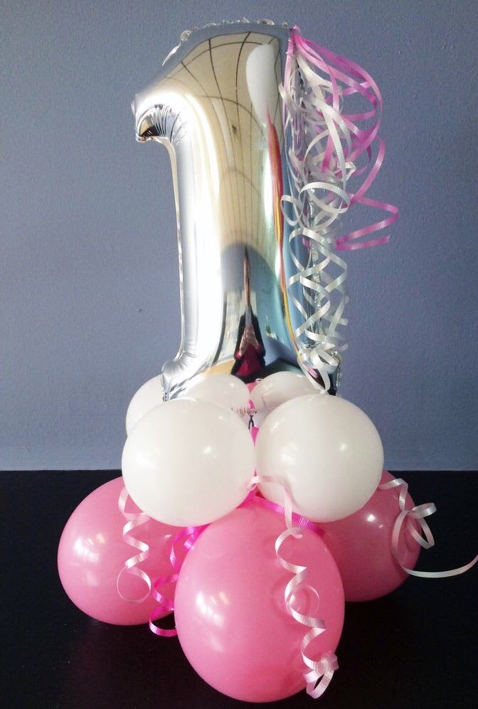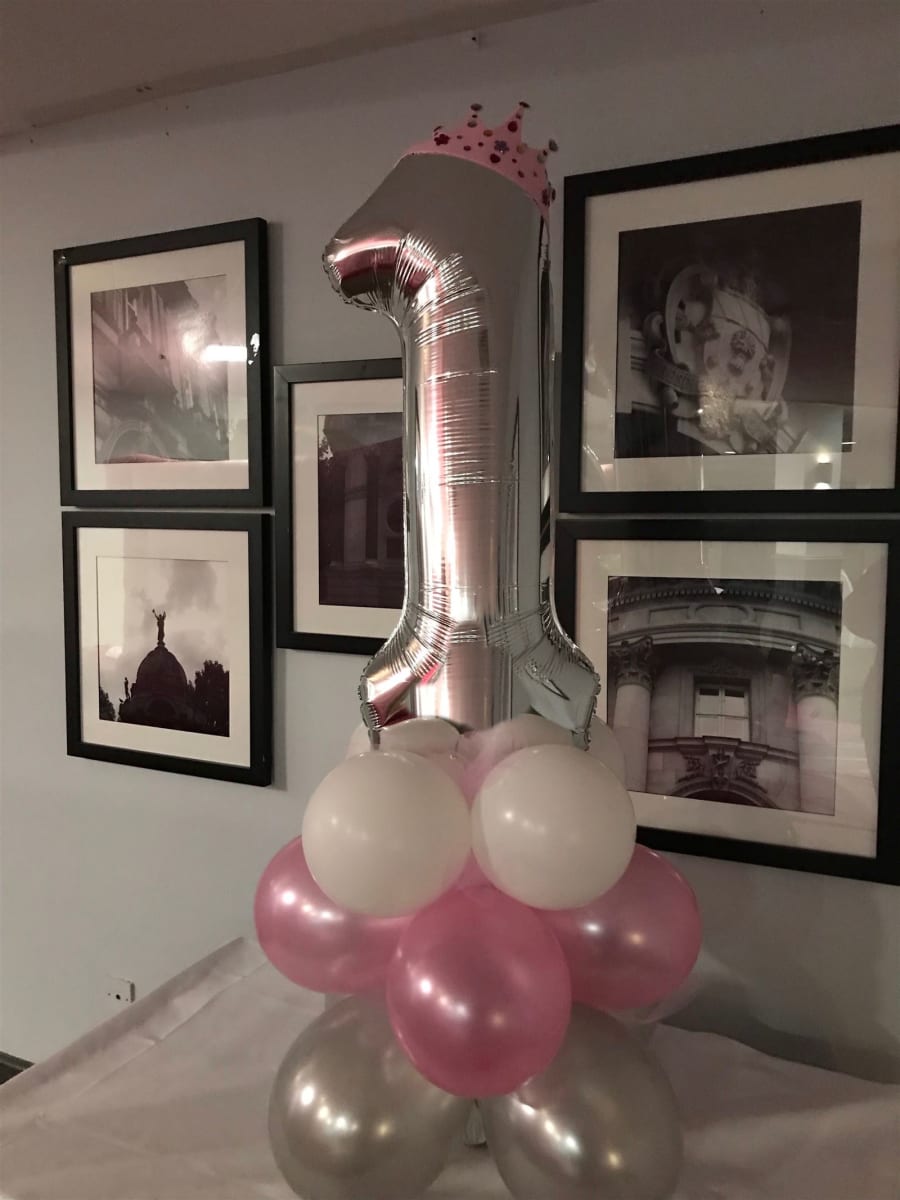 A foil number balloon sat on a base of smaller latex balloons which look fab for your little ones party.