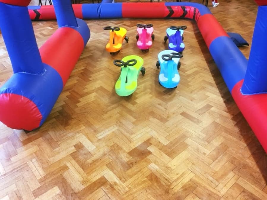 Our fab wiggle car grand prix will keep all budding F1 stars entertained for hours. Includes 5 wiggle cars and an inflatable track with start and finish points.