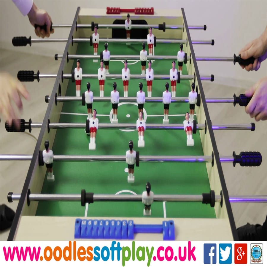 Our fab table football is ideal for occasions and is great entertainment at corporate events, team building days, college and school events. Table Football, also known as Foosball, Bar Football and Table Soccer, has been around since the 1920s starting life as a simple box game. The game typically features 2 teams of players mounted on rods that the players turns with a handle to kick a ball. There is a goal at each end and the aim is just as you would expect - score a goal and keep the other team out. The game can be played by 2 or 4 players and is fun, fast and competitive and appeals to all ages.